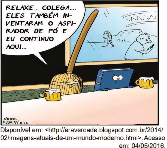 A linguagem não verbal usada pelo chargista nessa ilustração deixa clara certa atitude dos personagens que se soma às palavras da vassoura.