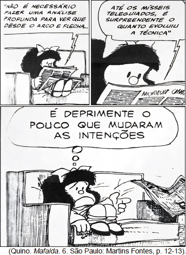 A linguagem dos Quadrinhos, em geral, traz uma crítica a um determinado aspecto da vida social ou, numa perspectiva mais ampla, da própria história da humanidade. Na presente Tira, Mafalda: