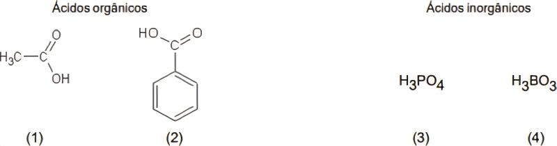 QuímicaEsPCEx2018Acidulantes são substâncias utilizadas principalmente para intensificar o gosto ácido de bebidas e outros alimentos. Diversos são os ácidos empregados para essa finalidade. Alguns podem ser classificados como ácidos orgânicos e outros como ácidos inorgânicos. Dentre eles, estão os quatro descritos pelas fórmulas moleculares e estruturais abaixo.