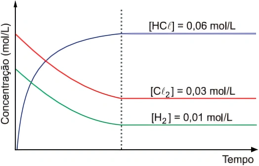 Considerando os dados da reação e do gráfico, pode-se concluir que o valor da constante de equilíbrio químico (Kc) para essa reação é