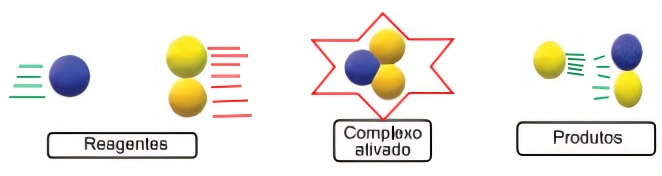 QuímicaUEA2022O esquema representa a teoria das colisões. Em condições adequadas, os reagentes colidem e formam o complexo ativado, que dá origem aos produtos.