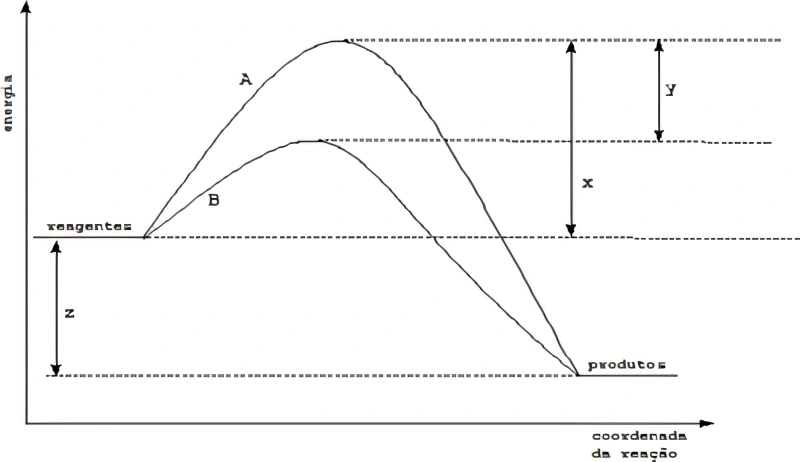 QuímicaUNIOESTE2018Atualmente, a indústria química se utiliza de uma vasta gama de catalisadores, que possuem a vantagem de tornarem as reações mais rápidas com menores custos. O gráfico abaixo representa a variação de energia de uma reação qualquer na presença e na ausência de catalisador.