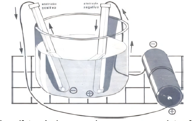 A figura a seguir representa minimamente um processo de eletrólise em um laboratório de química para o Ensino Médio.