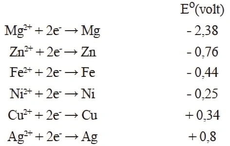 Potenciais de oxidação E0 : A- = +1,65 V; Fe= + 0,44 V; Cd= +0,40V; Zn = + 0,76V; Mg=+2,37V; Ca = +2,87V