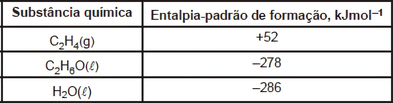 Considerando-se essas informações e os valores das entalpias-padrão de formação do eteno, do etanol e da água, relacionados na tabela, é correto afirmar:
