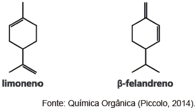 QuímicaUNIFOR2016Isomeria é o fenômeno de dois ou mais compostos apresentarem a mesma fórmula molecular, porém, fórmulas estruturais, e muitas vezes, propriedades muito diferentes. Por exemplo, os isômeros limoneno e β-felandreno (mostrados abaixo), onde este último pode ser encontrado nas essências de diversas plantas, tais como o funcho, o anis e o eucalipto. Já o primeiro pode ser encontrado em frutas cítricas e têm se mostrado ativo contra alguns tipos de câncer em ratos.
