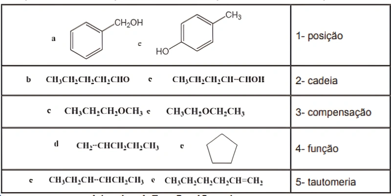 QuímicaFCMSJF2018O quadro a seguir apresenta pares de estruturas isoméricas. A sequência obtida ao se correlacionar os pares de compostos com o tipo de isomeria que existe entre eles é: