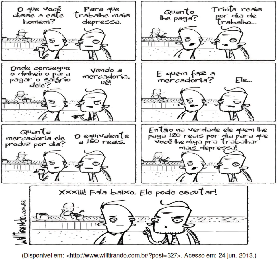 SociologiaUNEB2016A análise da charge e os conhecimentos sobre o desenvolvimento do capitalismo permitem corretamente afirmar que a situação descrita se refere