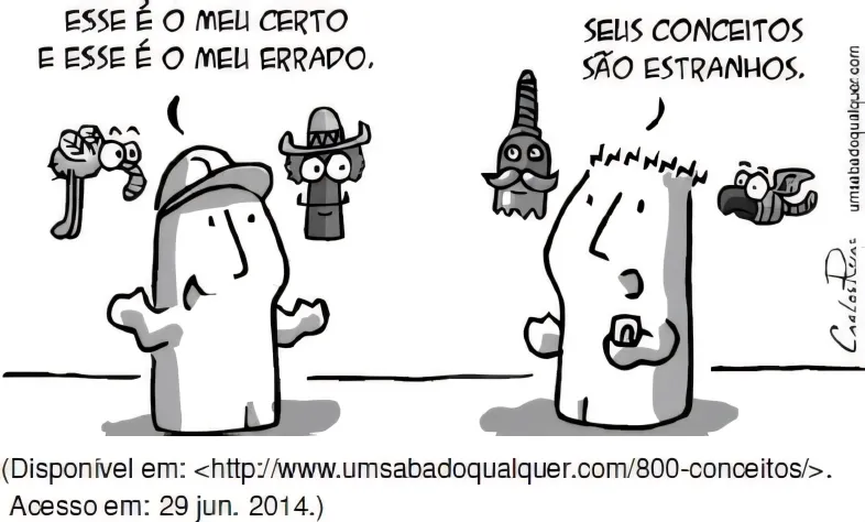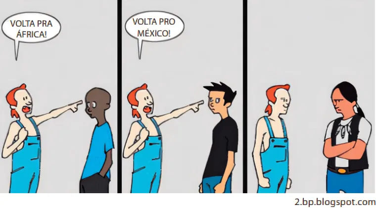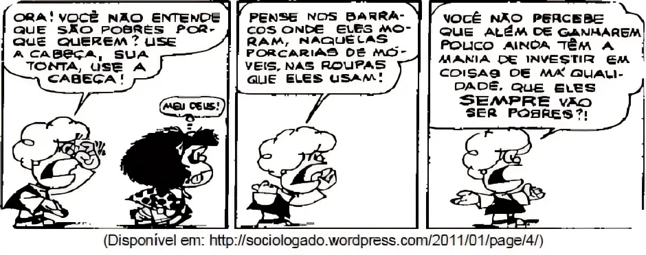 SociologiaUSS2013A situação apresentada nos quadrinhos é um exemplo da intolerância de indivíduos ou grupos que repudiam ou negam a possibilidade da convivência com a diferença, seja ela de origem cultural, étnica, social ou mesmo econômica.